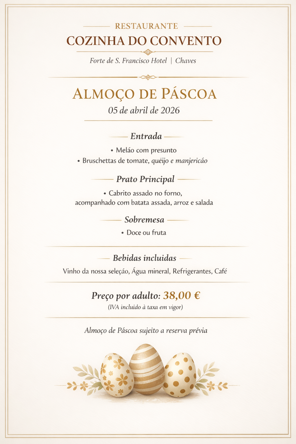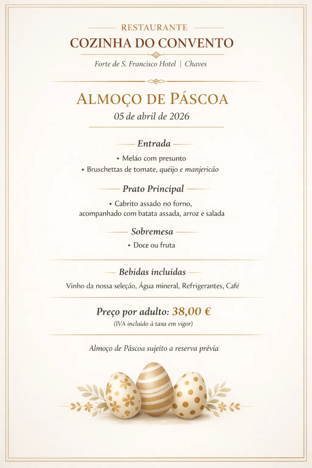 No dia 05 de abril de 2026, o Restaurante Cozinha do Convento, no Forte de S. Francisco Hotel em Chaves, convida a celebrar a Páscoa com um almoço especial, num ambiente único e acolhedor.